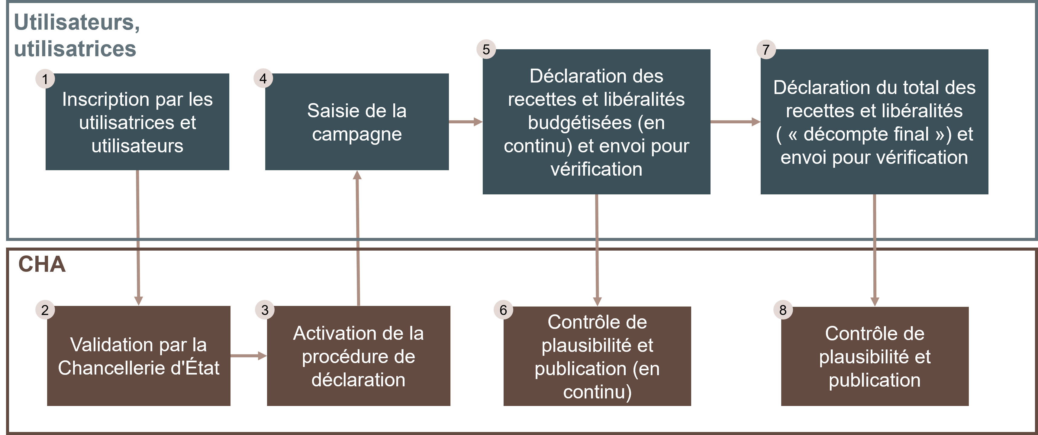 - Déclaration du total des recettes et libéralités (" décompte final ") et envoi pour vérification (utilisatrices/utilisateurs)